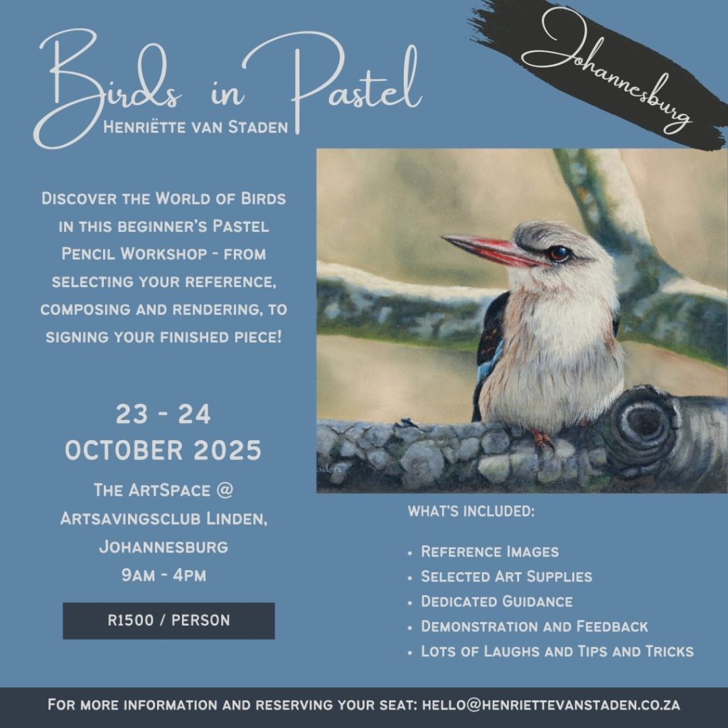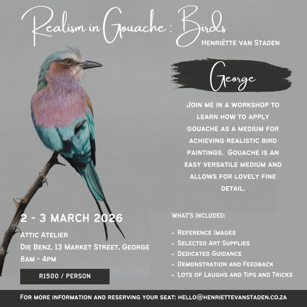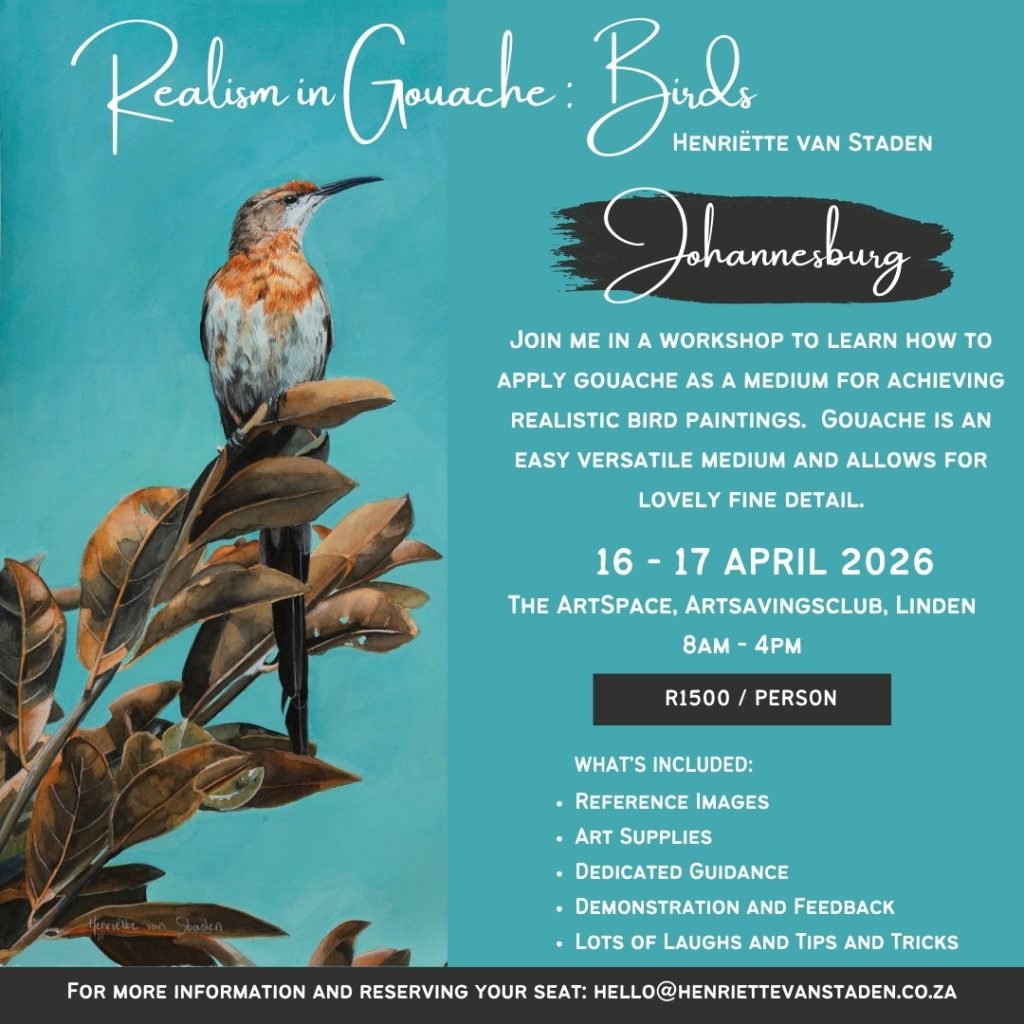 I will be offering a variety of subjects – mostly birds, pets, wildlife and botanical and these workshops will be divided into three types of media – Pastel (Pencil and Panpastel), Coloured Pencil & Gouache and Gouache.